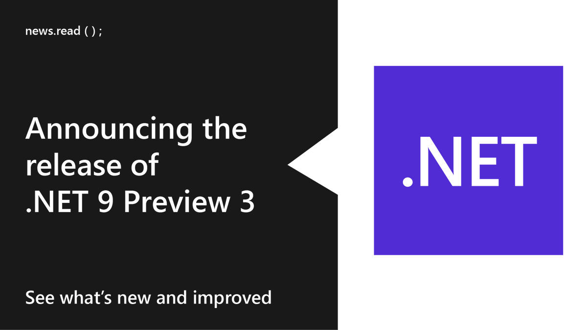 🎉 Announcing the release of .NET 9 Preview 3. 🙌 See what's new in #dotNET Libraries, Runtime, & SDK, including: ➖ The Tokenizers Library ➖ TimeSpan.From overloads ➖ Faster exception handling ... and more. Get details and resource links here ➡️ msft.it/6011cAcxU
