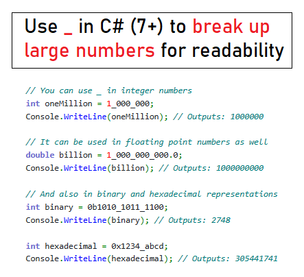 C# Digit Separator character examples 💡 Since C# 7 we can use _ to improve the readability of numeric literals. It's especially useful for large numbers and is for readability only, it does not affect the value of the number. What do you think? I love this feature. #dotnet
