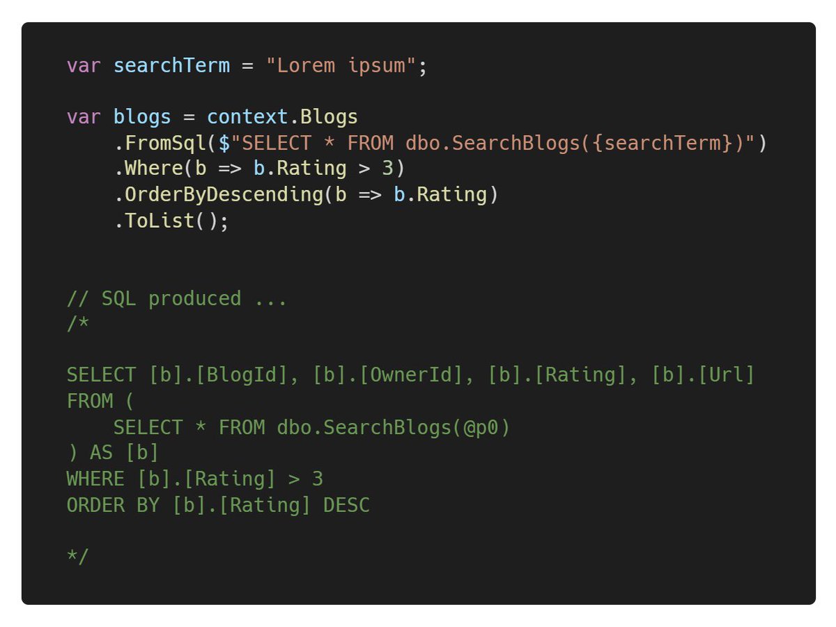 Mixing manual SQL and LINQ in one Entity Framework query example ⬇️ #dotnet pic.x.com/gy3IziZQsm