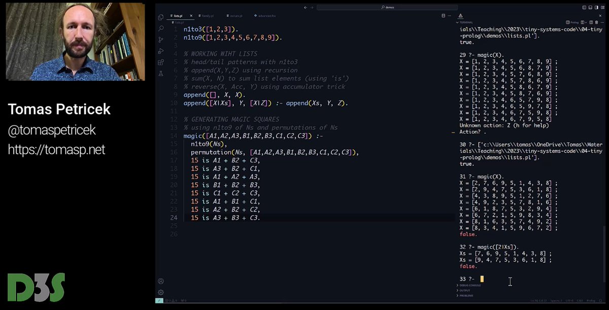 I uploaded a new video & code for my "Tiny programming systems" in #fsharp course: d3s.mff.cuni.cz/teaching/nprg0… Follow the tasks to implement your own logic programming (Prolog-like) system, with extremely inefficient magic square generator.